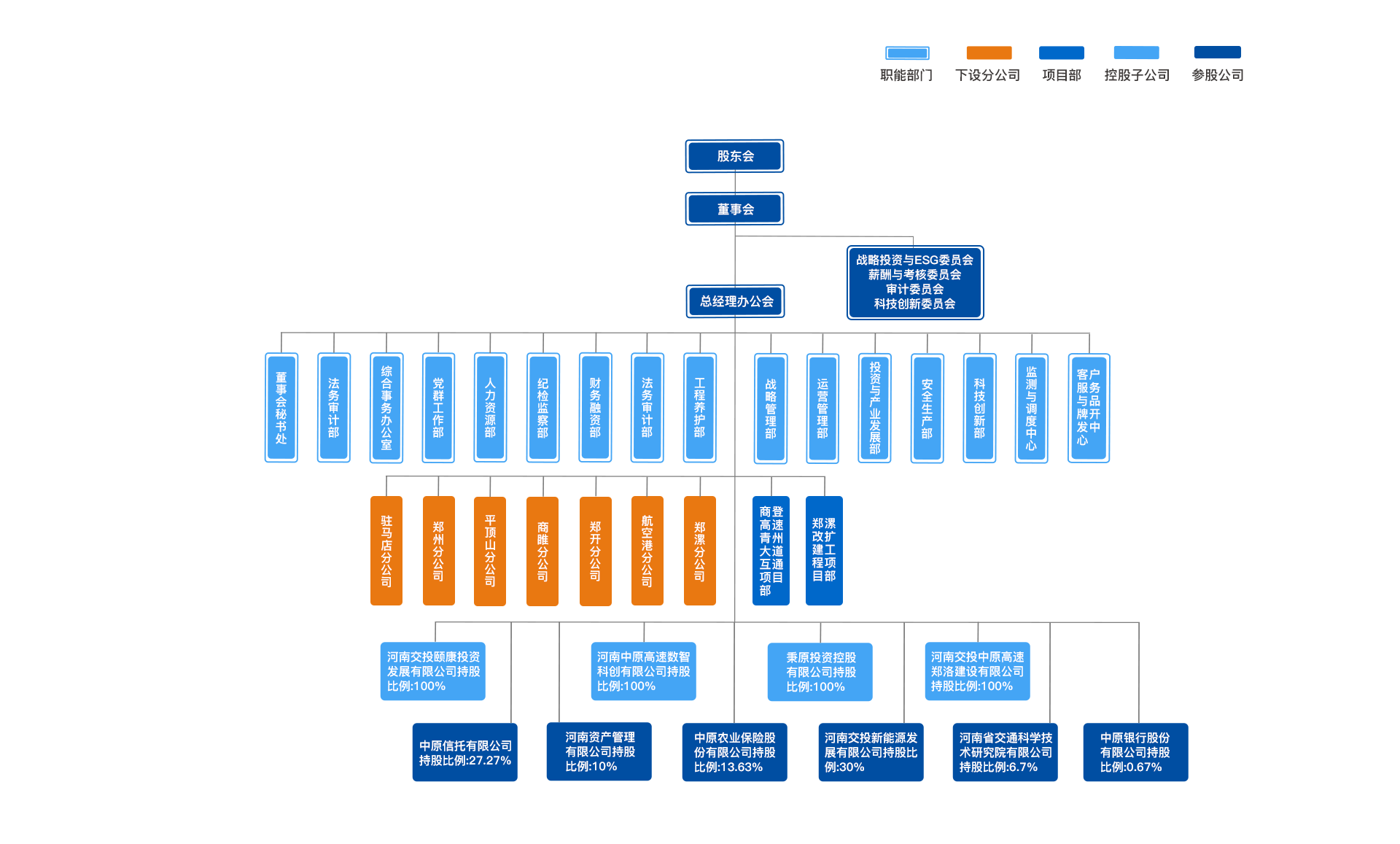 在主業(yè)穩(wěn)健的基礎(chǔ)上,公司大力發(fā)展多元化項目,目前已形成了以高速公路經(jīng)營為主,股權(quán)債權(quán)投資、基金、房地產(chǎn)、信托、保險、銀行、路域經(jīng)濟(jì)開發(fā)為輔的多元化發(fā)展戰(zhàn)略格局。目前擁有全資子公司4家,分別為:秉原投資控股有限公司、河南交投中原高速鄭洛建設(shè)有限公司、河南交投頤康投資發(fā)展有限公司、河南中原高速數(shù)智科創(chuàng)有限公司。參股企業(yè)6家,分別為:河南交投新能源發(fā)展有限公司、中原信托有限公司、中原農(nóng)業(yè)保險股份有限公司、河南資產(chǎn)管理有限公司、河南省交通科學(xué)技術(shù)研究院有限公司、中原銀行股份有限公司。